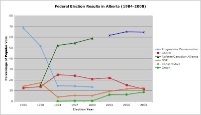 I’m in the midst of doing a bit of analysis into the Alberta results of the October 14, 2008 federal election, but in the meantime, here’s a look at the popular vote results over the past 24 years (partially to show off my excel skills and partly to impress my statistician friend).